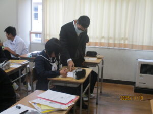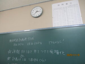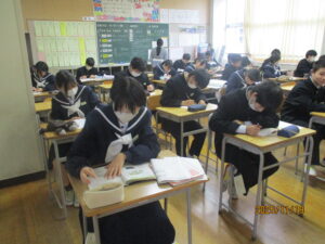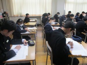 11月19日(水)6限、2学年では2学期の期末考査に向けた学習計画表を作成しました。生徒たちは目標点に到達するために、担任の先生に助言をもらいながら計画を練っていました。また、作成が終わった生徒からワークやプリント等、自主学習に取り組みました。