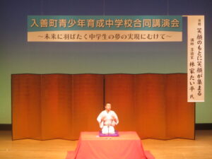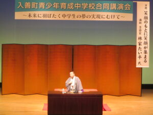 今回の講師は、落語家の林家たい平さん。演題は「笑顔のもとに笑顔が集まる」です。講演では、たい平さん自身の中学校から大学、そして落語家になるまでの実体験を通して、人との出会いや繋がりの大切さについてユーモアを交えながら話していただきました。その中でも、「人との出会いは決して偶然ではなく、必然である。目の前の人との出会いを大切にして、そこから多くのことを学ぼうとする姿勢が大切だ。」という話が心に残りました。後半30分間は「初天神」という落語を聞かせていただきました。目を閉じていると父と子の姿が目に浮かぶようで、落語の面白さを十分に楽しむことができました。