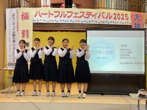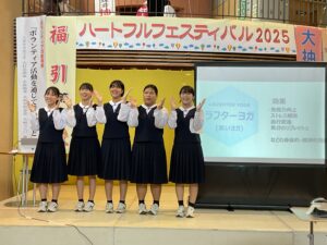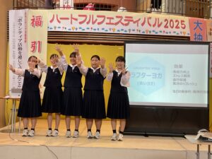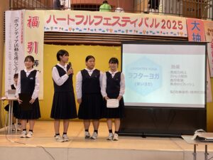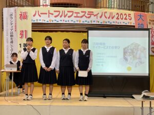 また、同じくサンウェルで行われたハートフルフェスティバル2025、ボランティア活動発表では、本校の生活委員長が「中学生がボランティアをする意義」と題して、入善中学校で実践している様々なボランティア活動をスライドを使って紹介しました。さらに、三年生4名が介護施設でのボランティア活動報告を行いました。活動を通して学んだ「笑いヨガ」を披露したり、入善町の介護サポーターポイント事業の紹介をしたりと、会場に笑顔と元気を届ける発表でした。
