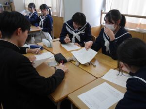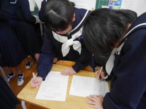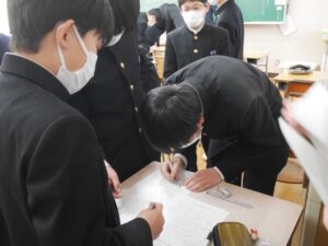 今日のできごと 【3学年】ソーシャルスキルトレーニング 2026年1月21日 入善中学校情報担当 1月21日(水)の6限に、ソーシャルスキルトレーニングを行いました。 受験期特有の不安やプレッシャーを和らげることをねらいとし、今の正直な気持ちや愚痴、そして自分なりのリフレッシュ法を書き出して共有する「共感ビンゴ」を行いました。 活動中は「分かる!」「私も!」といった共感の声や笑い声が飛び交い、和やかな時間となりました。 「不安なのは自分だけじゃない」と実感できたことで、クラスの団結力がより一層強まったようです。このチームワークで、残りの受験シーズンを乗り切っていきます。