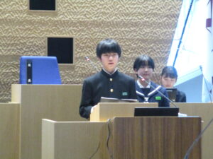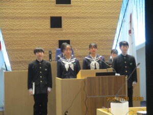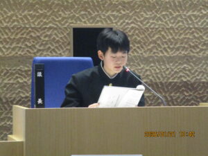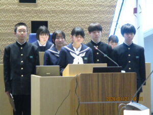 今日のできごと 【1学年】中学生議会 2026年1月21日 入善中学校情報担当 1月21日(火)14:00~にゅうぜん中学生議会が開催されました。入善中学校と入善西中学校両校の全生徒が参加し、入善中学校からは、9名の代表生徒が入善町役場の議会場で提言を行いました。それ他の生徒は、オンラインにて参加しました。入善中学校からは、「中学校統合の必要性と候補地」、「杉沢の沢スギの保全とPR」に関する提言を行いました。これからの入善町が「人と人との交流が活発な町」になるよう、住民の一員として私たちにできることを考え続けていきたいと思います。