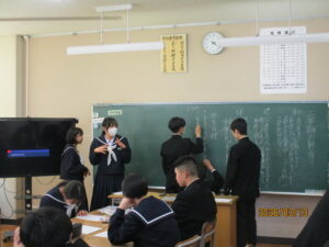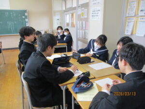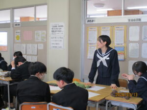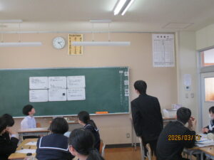 13日(金)の学活の時間に、学級の3学期を振り返るための学級会を行いました。学級運営委員が司会・進行、書記を務めるなど、生徒が主体となって学級会を進め、3学期における学級の良かった点や改善点を振り返りました。