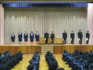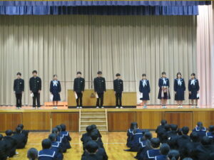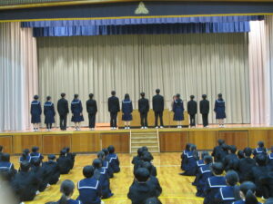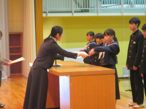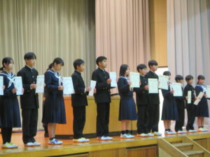今日のできごと 第4回受賞伝達、受賞披露を行いました 2025年11月20日 入善中学校情報担当 11月20日(木)6限後に、受賞伝達、受賞披露を行いました。 夏休みの課題として取り組んだ絵画や短歌、俳句、図案等の作品やとやま科学オリンピック、県中学校駅伝大会、新川地区新人大会等において31の受賞があり、一人一人の受賞伝達、受賞披露に対して温かい拍手が送られました。壇上の生徒はもちろん、入善中学校の生徒一人一人が素晴らしい力をもっていると感じる時間でした。今後も、いろいろなことに関心をもち、そして挑戦し、体験を通して学びを深めてほしいと思います。