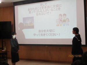 今日のできごと 【2学年】薬物乱用防止教室を行いました 2025年12月3日 入善中学校情報担当 12月3日(水)5限に、学校薬剤師の坂東みゆ紀先生をお招きし、薬物乱用防止教室を開催しました。 薬物依存から起こる障害や犯罪などの怖さを再認識し、絶対に薬物に手を出さないという強い意志をもつための有意義な時間となりました。 坂東先生、貴重なお話をありがとうございました。