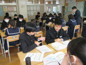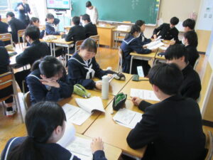今日のできごと 3年生 租税教室を行います 2025年12月17日 入善中学校情報担当 12月17日(水)2、3限 北陸税理士会魚津支部の税理士 長崎悦子 様を講師にお迎えし、租税教室を行います。 国税である、所得税、法人税、相続税、消費税等について、お話しいただきます。「おもちゃの付いたお菓子の消費税率は何%でしょうか?」という長崎先生の問いかけに生徒たちはグループになって話合い活動を行っていました。