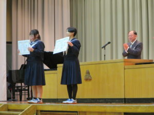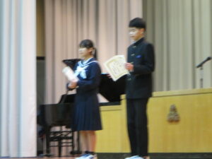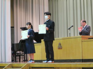 今日のできごと 特別表彰の受賞伝達が行われました 2026年3月11日 入善中学校情報担当 3月11日(水)同窓会入会式等の後に、特別表彰(富山県をよくする会、県中体連スポーツ表彰、県中文連文化表彰、各善行表彰等)の受賞伝達が行われました。