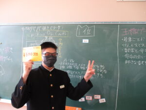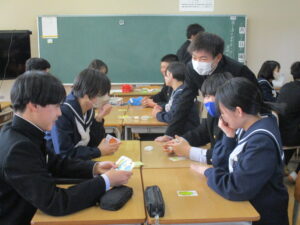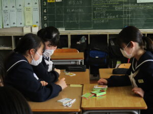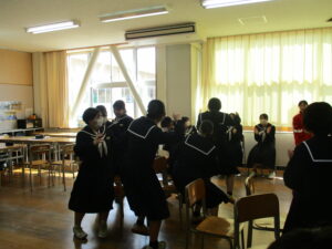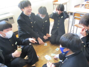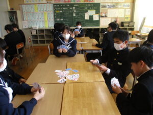 5限には各学級で最後の思い出づくりとして、レクリエーションを行いました。カードゲームやフルーツバスケット等、それぞれの学級で仲間たちとの楽しい時間を過ごし、どの生徒も笑顔にあふれていました。また、担任の先生へのサプライズで合唱をプレゼントする学級もあり、生徒たちの温かい面も見られました。