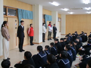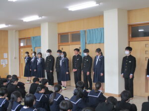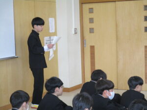 23日(月)2限、2学年では今年度最後の学年集会を行いました。集会では、学級運営委員が各学級の振り返りを発表し、その後に学年担当教員から1人ずつメッセージをいただきました。
